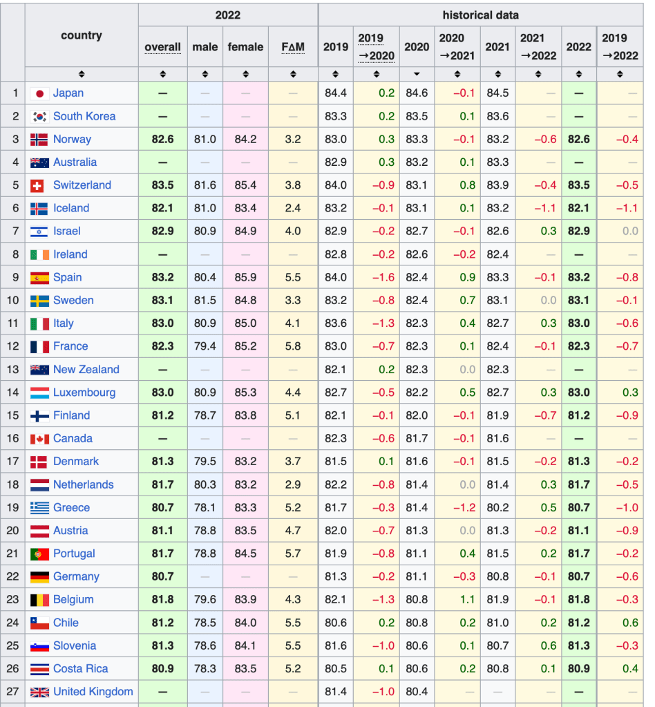 The following table taken from Wikipedia shows OECD countries sorted by life expectancy in 2020 – source: https://en.wikipedia.org/wiki/List_of_countries_by_life_expectancy :