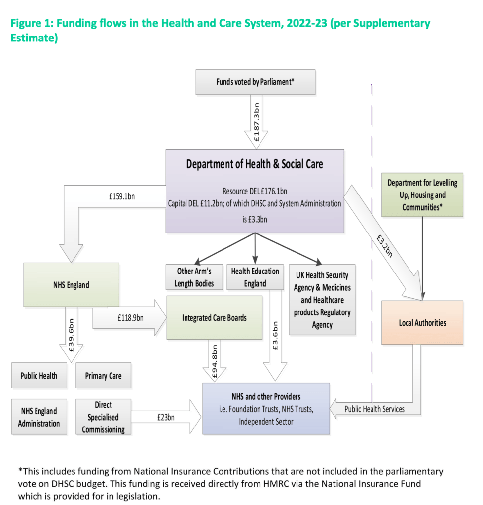 If we start at the top of the diagram, the funds allocated to healthcare by Government to the Department of Health & Social Care is £187.3 bn. Of this, the bulk (£159.1 bn) is transferred to NHS England. The remainder (£ 28.2 bn) is distributed to a number of bodies: