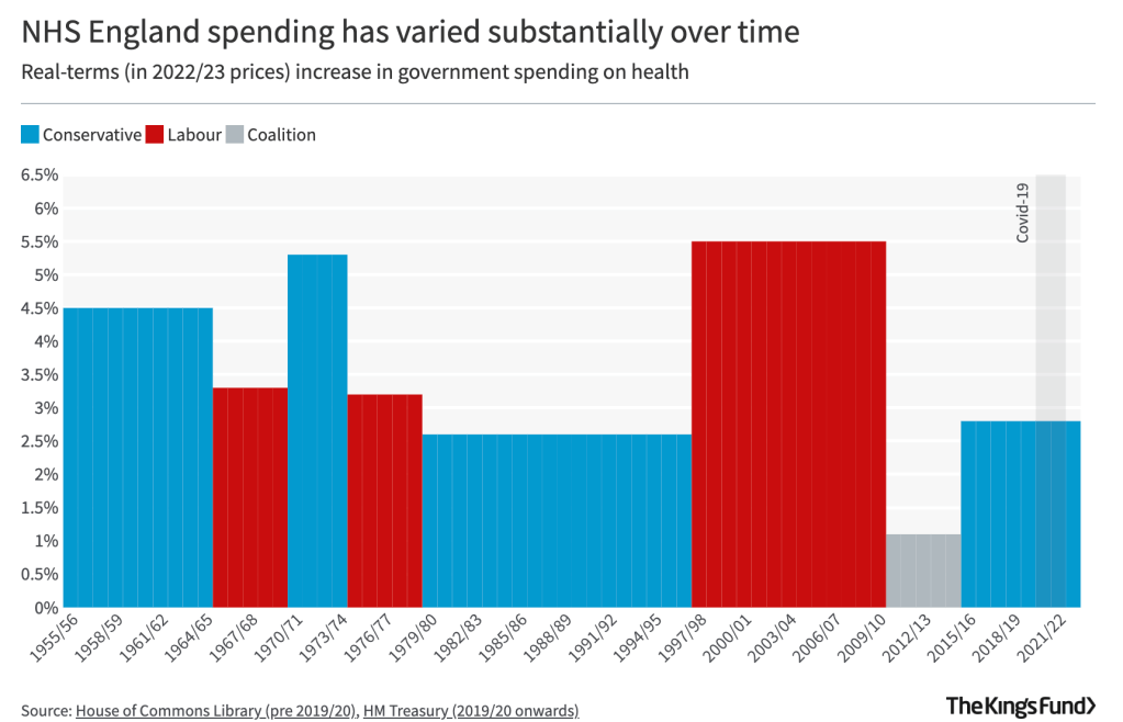 The King’s Fund website has compiled charts showing increases in NHS England spending as well as total spending: