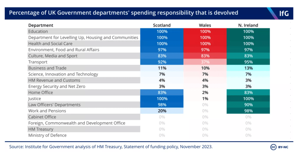 As the table shows, setting a budget and 100% of spending decisions for Health and Social Care in Northern Ireland, Wales and Scotland are the responsibility of each devolved administration.